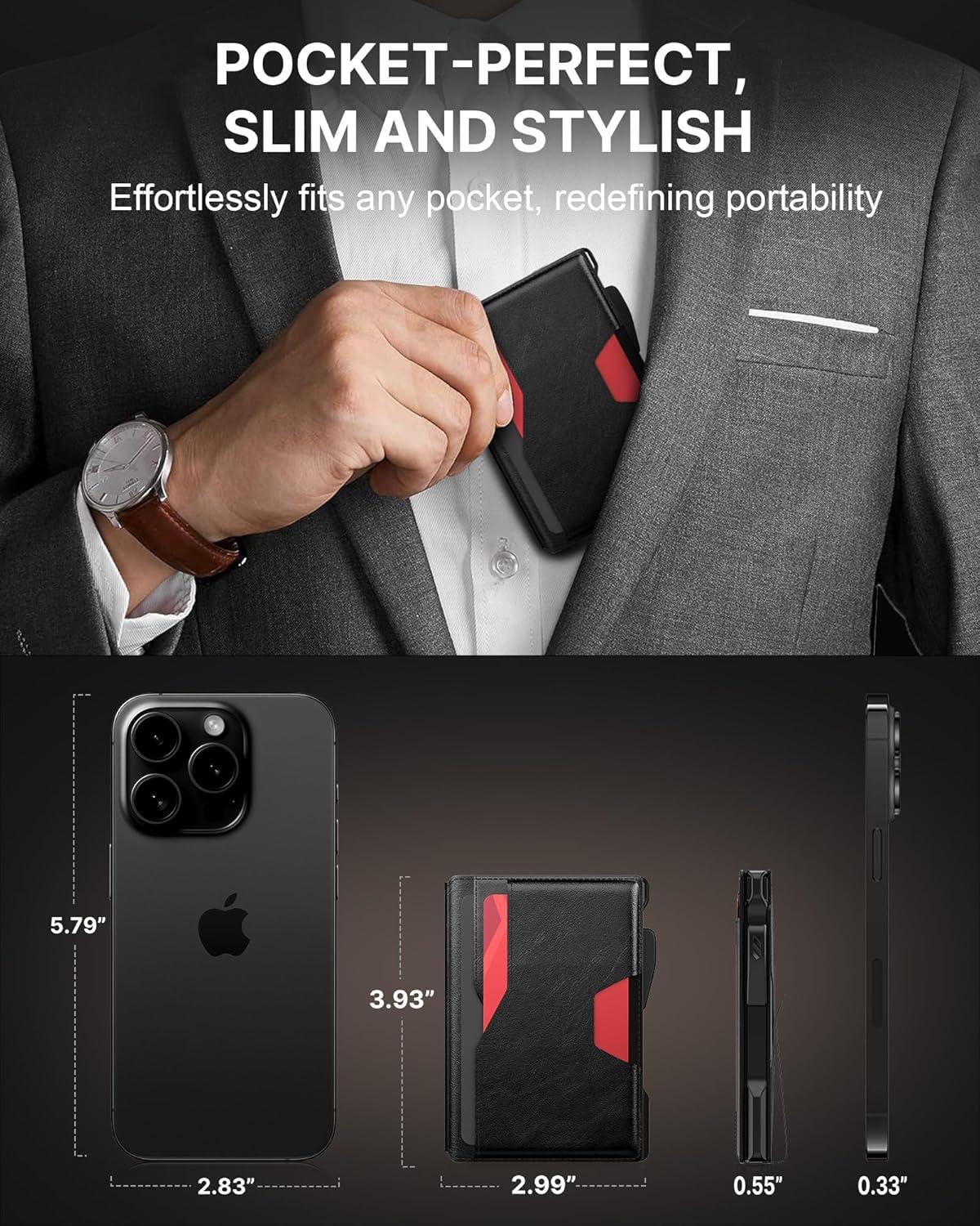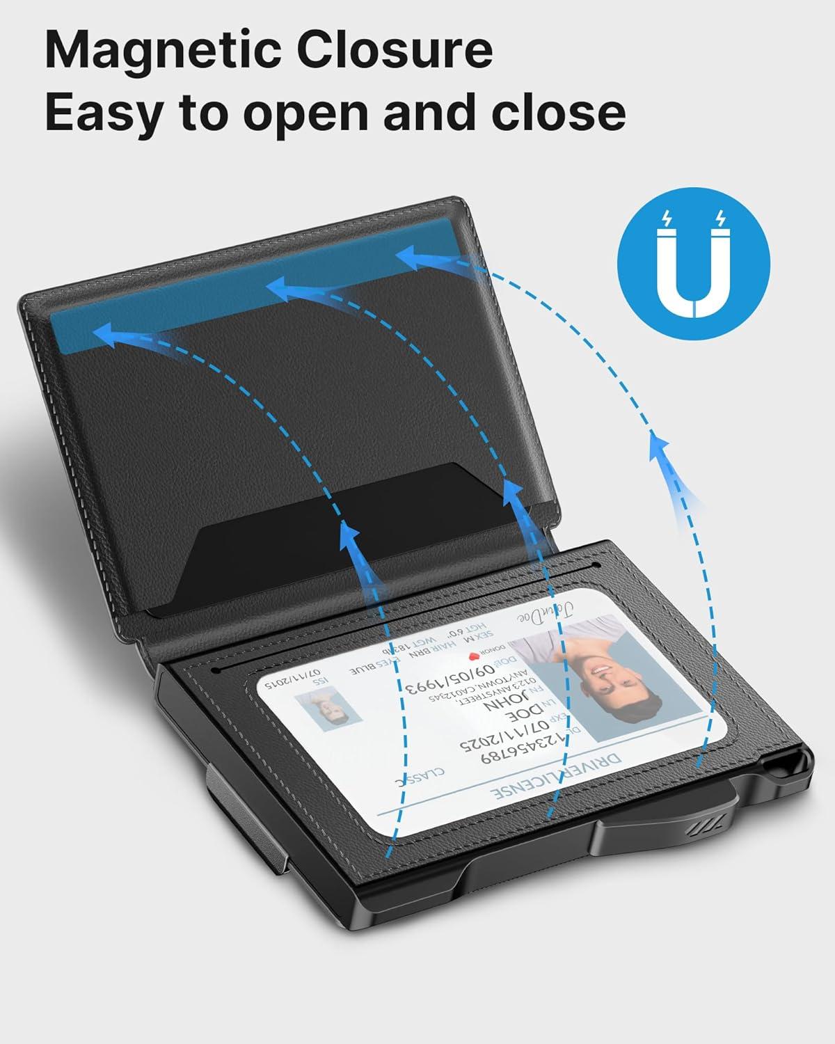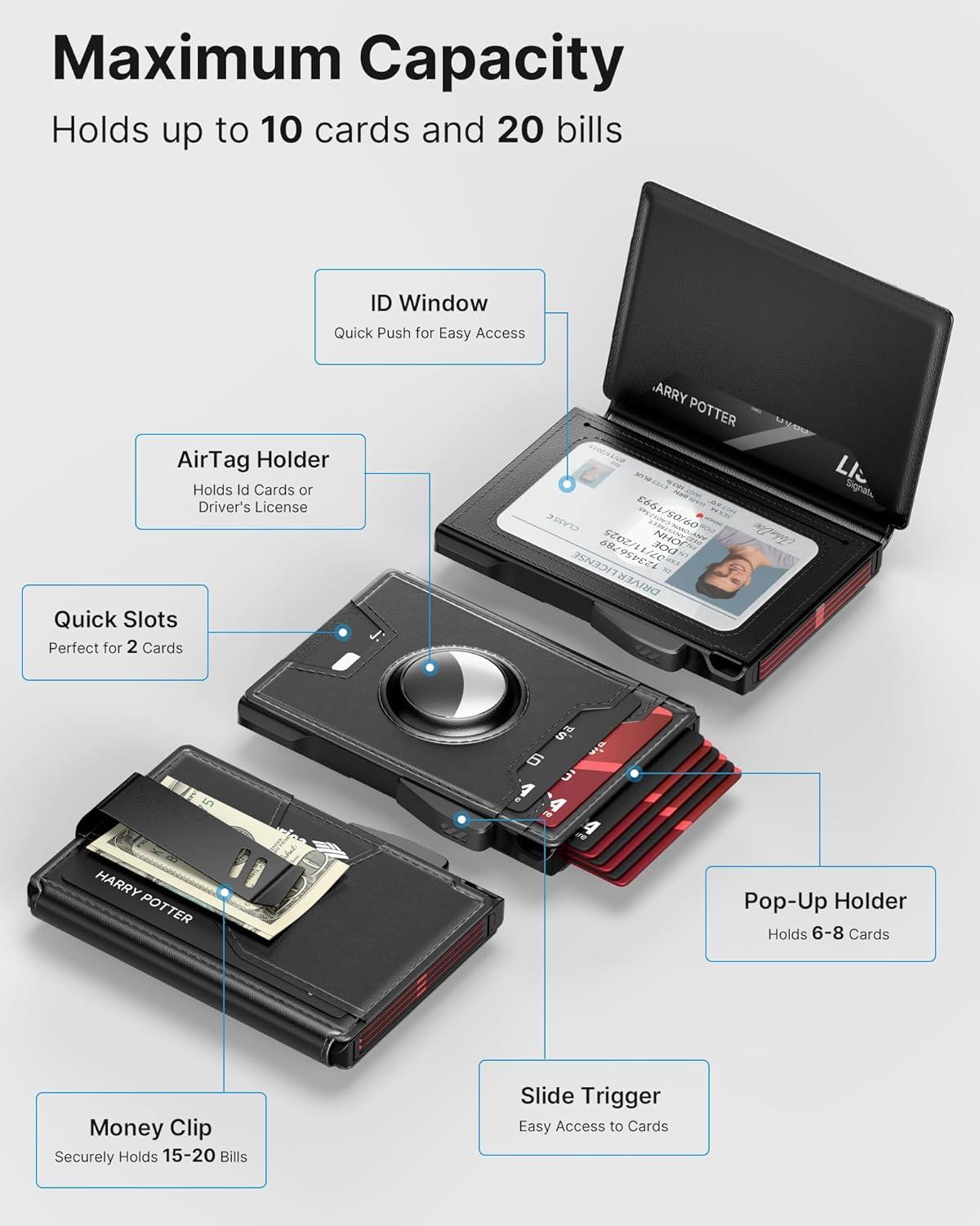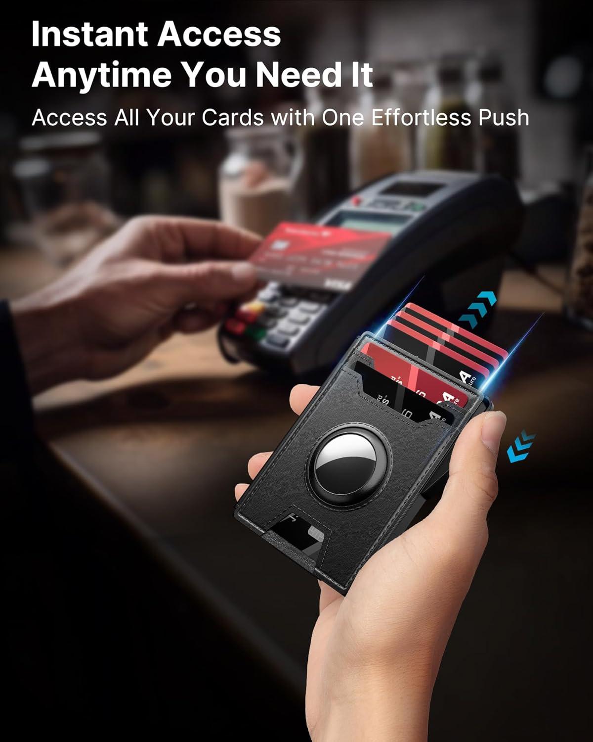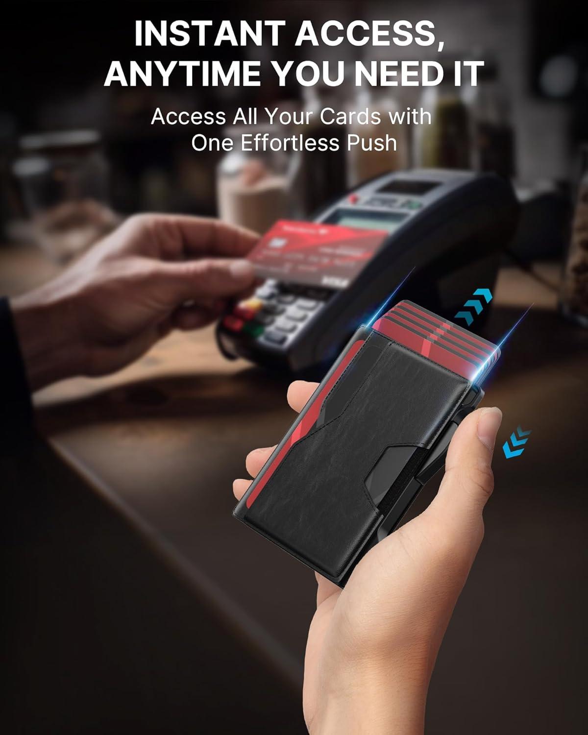 Quick Card Access: Designed for speed, this wallet's smart pop up mechanism allows you to instantly view and select your cards. The front and back pocket provide 3 quick-release option for your frequently used card, ensuring they're always within reach.